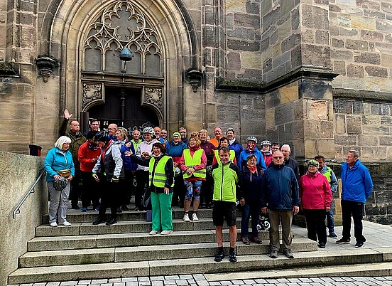 Ohne Pilgerstab aber mit viel Enthusiasmus und mit herrlichem Sonnenschein im Gepäck machten sich am vergangenen Pfingstmontag 32 Radler aus Ansbach und Umgebung auf den Oberfränkischen Jakobsweg. Es war die zweite Tour, die der ADFC Ansbach unter der Leitung von Waltraut Kaufmann-Schmider organisiert und unternommen hat. Ein Reisebus mit Radanhänger brachte die Gruppe zu ihrem Startpunkt in Berg bei Hof. Vorher wurde noch ein Abstecher ins ehemals geteilte Dorf Mödlareuth gemacht.Unter kundiger Führung konnten sich die Teilnehmer im Deutsch-Deutschen Museum und am „Tannbach“ ein Bild von der 30 Jahre währenden menschenverachtenden Teilung Deutschlands machen.